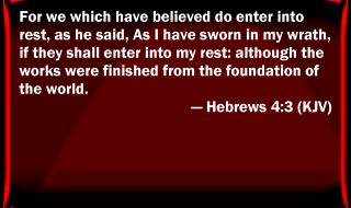Hebrews 4:3: For we which have believed do enter into rest. Thank you, Lord that all of your mighty works were finished before the foundation of the world. You have decreed. You have declared. You have ordained. You have predestined, and all of that has been recorded in heaven and will be accomplished on earth.