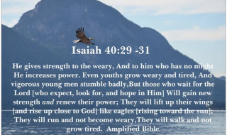 Isaiah 40:29-31: 29 He giveth power to the faint; and to them that have no might he increaseth strength.Even the youths shall faint and be weary, and the young men shall utterly fall:But they that wait upon the Lord shall renew their strength; they shall mount up with wings as eagles; they shall run, and